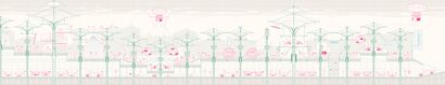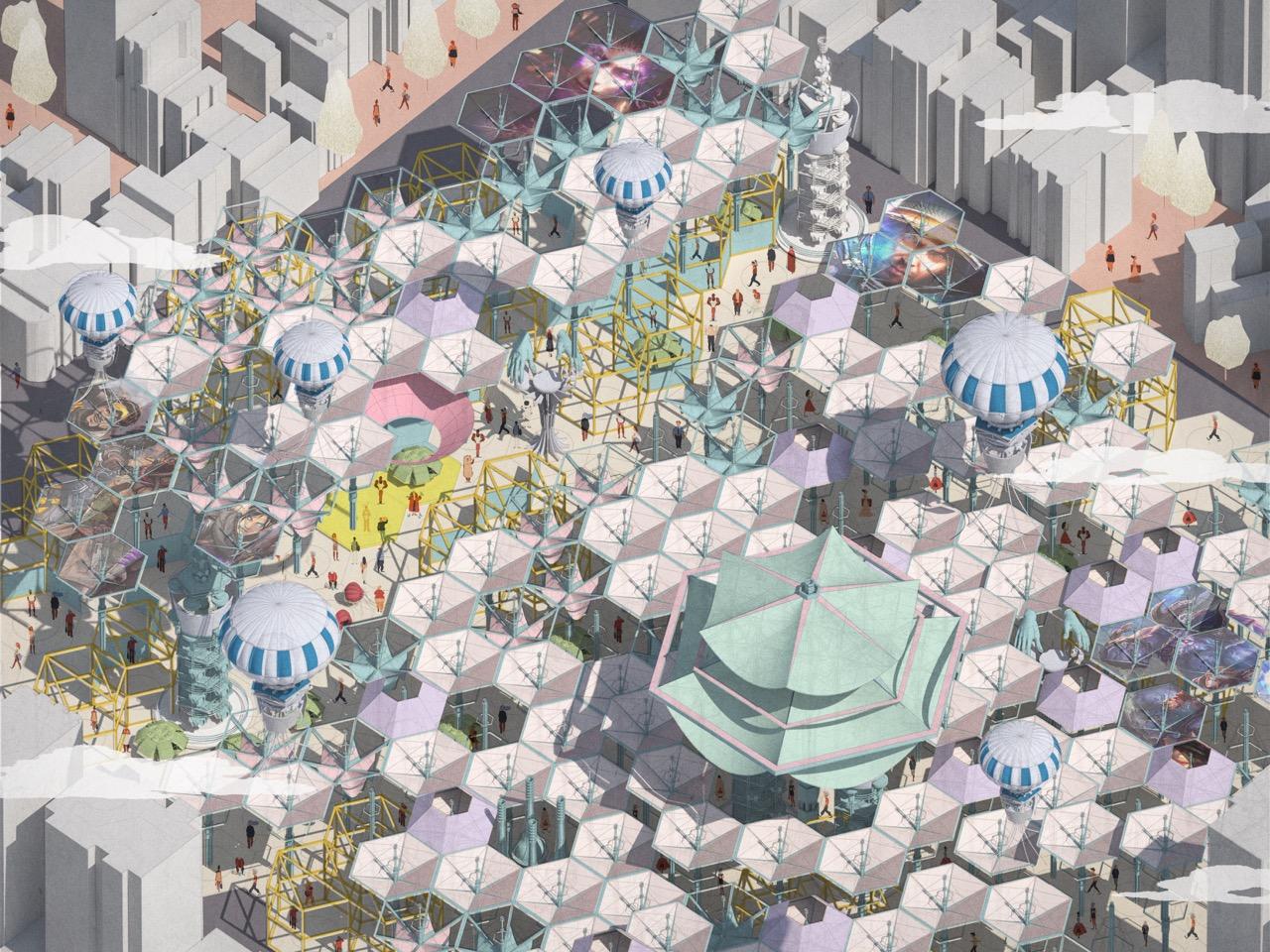 This particular piece visualizes a speculative esports pavilion as both an arena and a ritual ground. It examines how infrastructure can adapt to fluid modes of engagement—where presence is networked, space is temporary, and participation is shared across screens and bodies. The work draws from both urban spectacle and intimate interaction, asking what role architecture plays in the emotional landscape of digital culture.