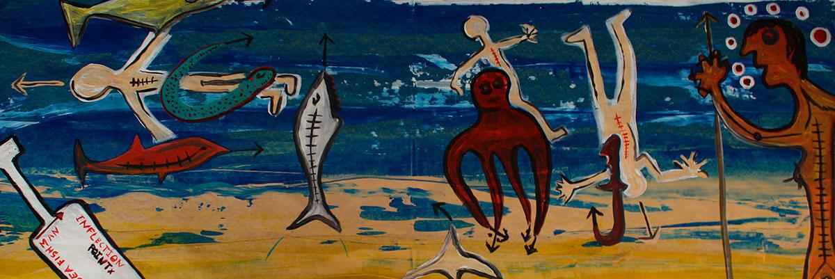 Inflection is a surreal marine myth—a procession of strange creatures drifting through a dreamlike sea. Hybrid beings float, sink or rise: stitched bodies, arrowed limbs, a red octopus with human eyes, and fish that resemble skeletons. The bottle that drifts ashore reads “Inflection Remix,” hinting at a coded message, a transformation in motion.