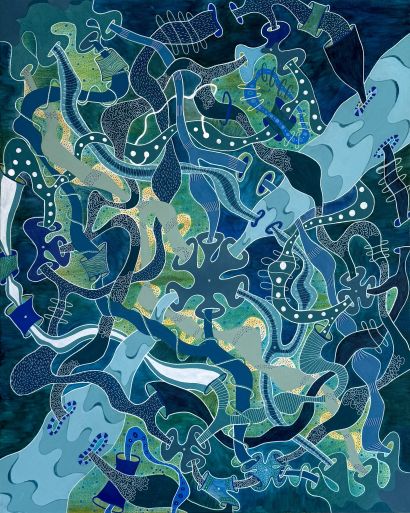 In this work, feminine and masculine energies intertwine, giving form and presence to what is most precious: something unique, irreplaceable. At its center lies a golden ring, a symbol of balance and connection, embracing both forces. Yet creation carries weight. Within us, we carry traits, patterns, and echoes of past generations that shape who we are.